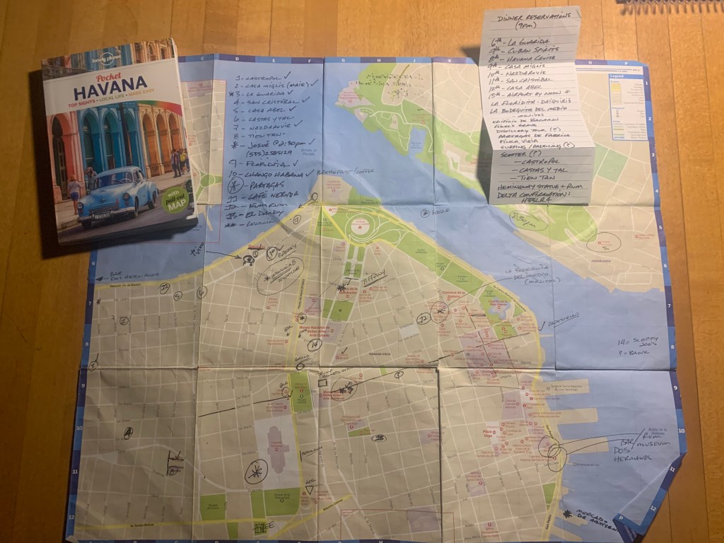 During my flight over I brought a copy of The Old Man and The Sea – perhaps a cliché but it was the perfect read in anticipation for my arrival in Cuba – and simply devoured it on the flights to Havana. I was done reading it well before I landed, and now I was even more charged up to see Cuba, and especially Finca Vigia (that’s where Hemingway’s Wheeler is now stored). I also brought along my Lonely Planet Pocket Havana guide book with all of my destinations already mapped out in black marker on the map of the city. All of the restaurants I had reservations for, all of the scenic touristy spots, ALL of the bars and nightclubs, and of course my home on the top floor overlooking the malecón (Havana’s Rivera). I had dinner reservations every night at 9pm at a different “underground” restaurant. (I’ll be posting later about dining in Havana)