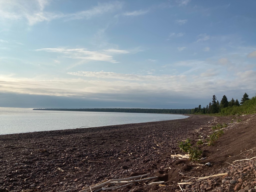 We decided to take a zero day and stay at Siskiwit another night, skinny dipping (brrrr Lake Superior!) and exploring the beaches nearby. CK coaxed me out onto a sandbar near the Siskiwit River outlet, and we spent a long time watching the current patterns there and the fish and birds hunting bugs.